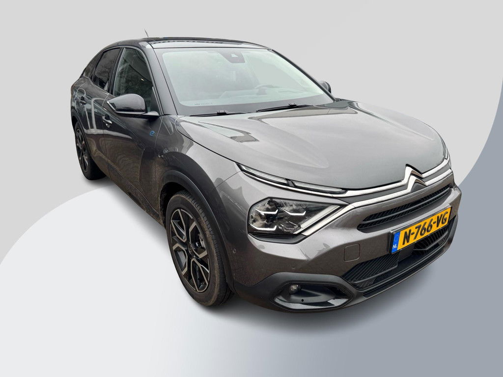 De Citroen Ë-C4 vertegenwoordigt de nieuwe generatie auto’s en verenigt elektrische kwaliteit en duurzaamheid met elkaar. De aandrijflijn maakt gebruik van de meest moderne accutechniek, zodat het opladen in zo kort mogelijke tijd gebeurt. Het rijbereik van deze auto is groot genoeg om er de meest voorkomende dagelijkse ritten mee te maken. Op de teller van deze auto staat slechts 22415 kilometer. Topklasse: daar hoort leren bekleding absoluut bij. Zit u goed? Nou, zeker wel, met de comfortstoelen! Qua licht en ruimtelijk gevoel zit het helemaal goed met het elektrisch bediende panoramadak. Hoe koud het buiten ook is, het verwarmbare stuurwiel brengt uw handen en vingers snel weer op temperatuur. Tot de uitrusting van deze Citroen behoren ook 18 inch lichtmetalen velgen, Full LED koplampen, halflederen bekleding, adaptief dempingsysteem, geluidsisolerende ramen en in delen neerklapbare achterbank.